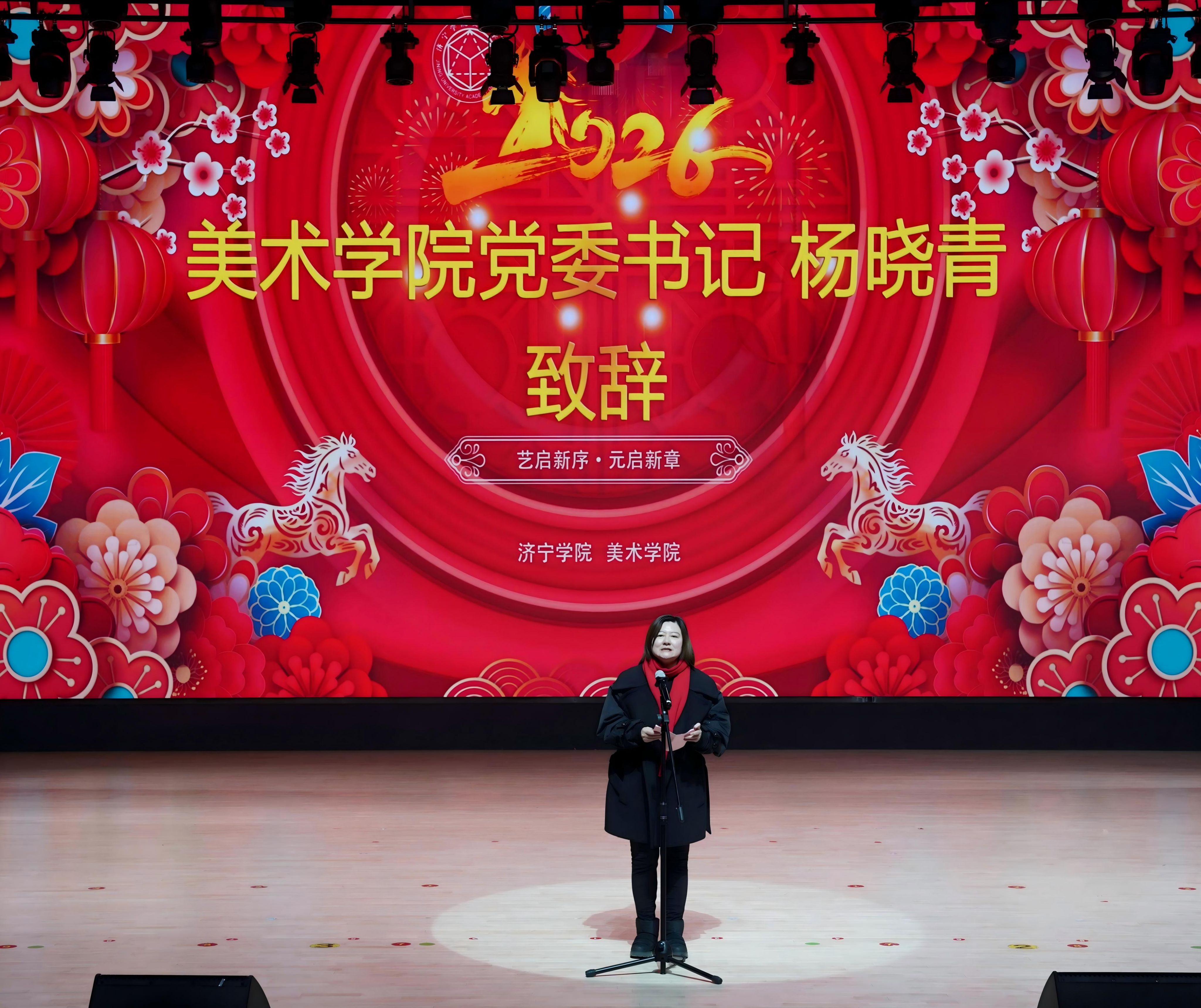 1月12日,美术学院在学校艺体中心音乐厅成功举办“艺启新序·元启新章”联欢会,济宁学院党委委员、宣传部部长刘克非,美术学院党委书记杨晓青、院长张继华、党委副书记冯秉政、副院长刘乾出席,400余名师生齐聚一堂观看演出。杨晓青致辞,向全体师生致以真挚祝福与问候,回顾了美术学院在2025年取得的成绩与收获,鼓励全体师生继续保持锐意进取的奋斗姿态与永不言弃的拼搏精神,在...