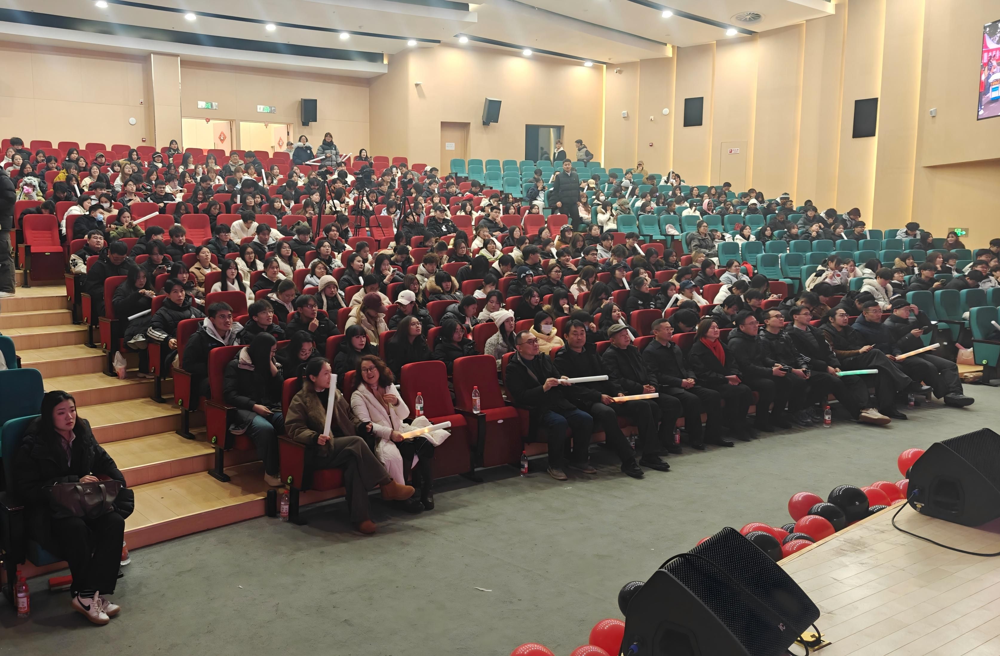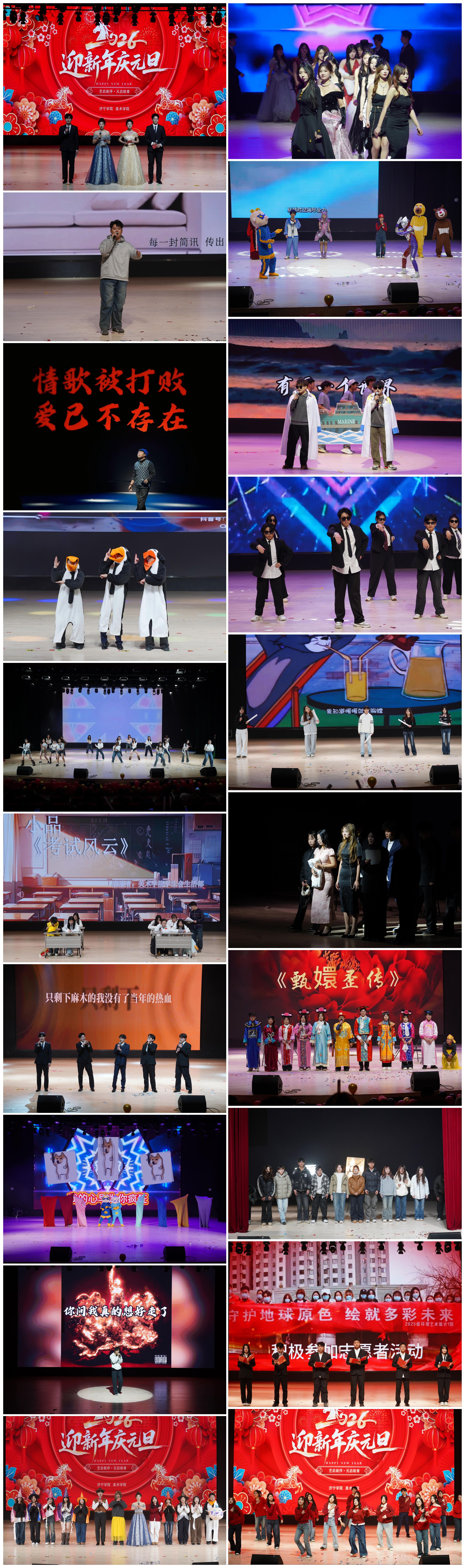 联欢会中,19支精彩节目轮番登台,有多名国际留学生参与其中,节目形式新颖、内涵丰富,充分展现了校园文化的多元与活力。舞蹈《串烧》《爱如火》《小鸡舞》《野狼DISCO》、走秀《ELENA》惊艳亮相,生动勾勒出青年人奋发向上的精神底色与别具一格的艺术创想;歌曲《水手》《老男孩》《花海》《暖暖》《聆听童年》《只对你说》《MARRY》交织奏响,歌声或甜蜜温馨或轻快悠扬或慷慨激昂,如同潺潺细流浸润着观众心灵;小品《考试风云》《甄嬛传滴血认亲》《白雪公主与七个大高个》、话剧《风声》、影子剧《青春》以多元题材串联起历史与当下,在回望先辈革命峥嵘岁月的同时,热忱歌颂着当下所处时代的美好;朗诵《青春扬帆正当时·争做时代追梦人》缓缓铺陈、浸润人心,将青春的朝气与追梦的执着融入字里行间;舞蹈《相亲相爱一家人》温情上演,舞步间尽是对“美院”大家庭的眷恋与热爱,令观众深深地陶醉在幸福美满中,为联欢会画上了圆满的句号。