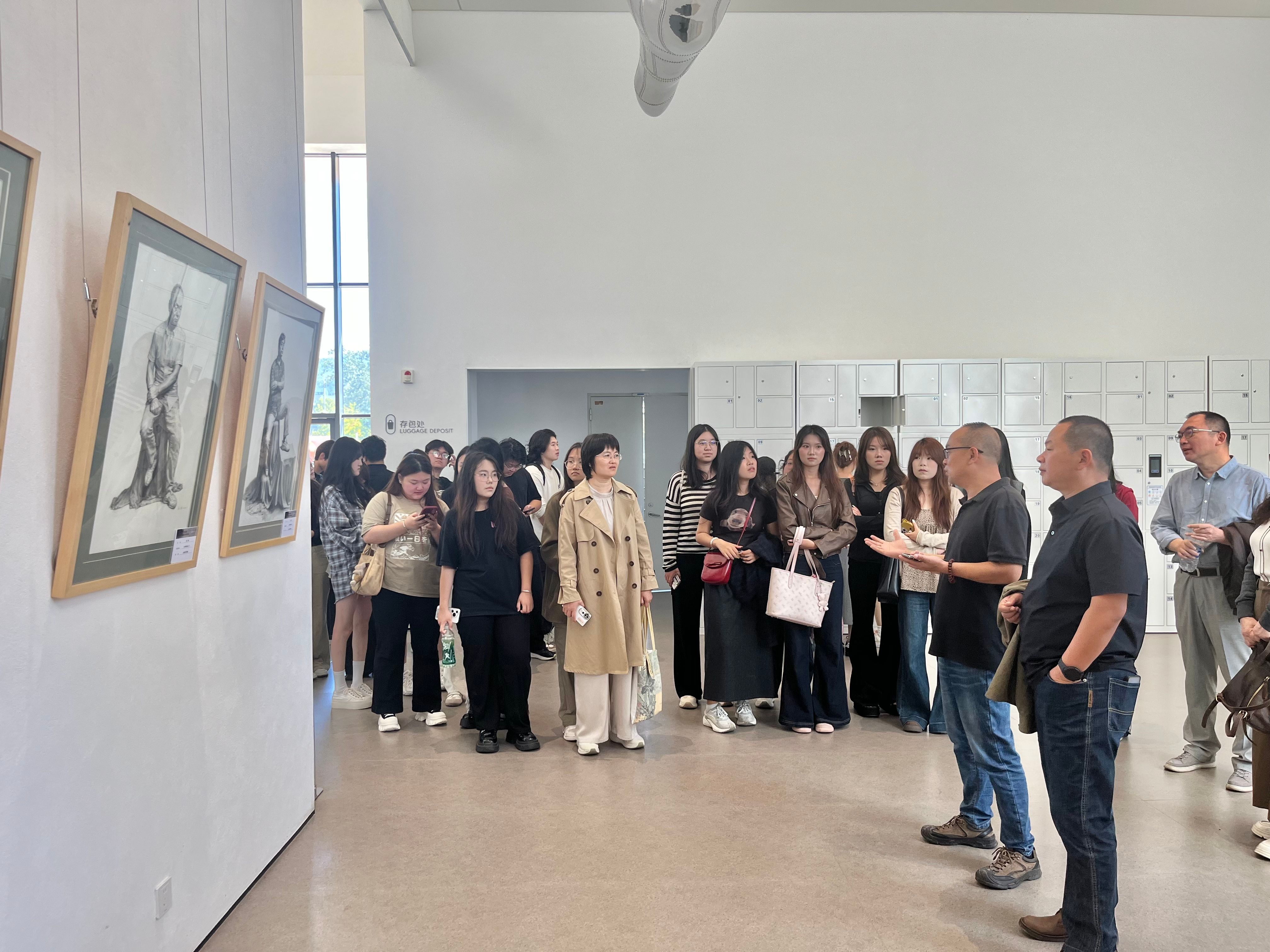 在山东艺术学院美术馆,师生参观了“全国高校素描教学展”。该展览汇集了全国多所高校美术专业优秀素描教学成果,涵盖静物、人像、人体等多元题材。张继华结合展品,从线条运用、明暗处理、空间构建、情感表达等方面为学生细致讲解,学生们认真聆听、驻足观察,学习氛围浓厚。