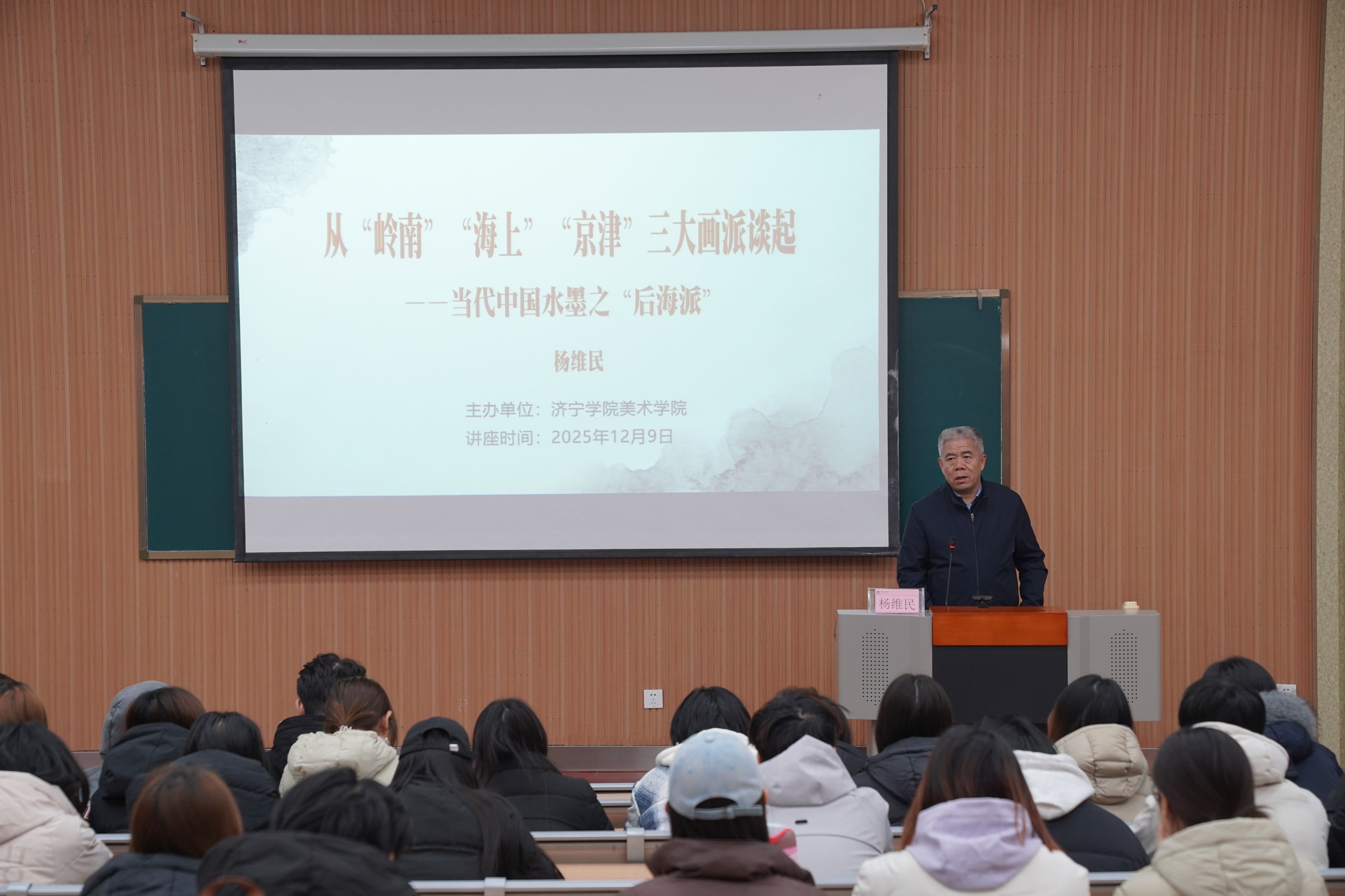 12月9日,美术学院邀请美术学教授、美术批评家、独立策展人、《艺术之旅》主编、湖北美术学院艺术人文学院研究生导师、南通大学艺术学院研究生导师兼后海派艺术中心主任、湖北美术学院当代中国画创研中心学术主持杨维民先生作题为《从“岭南”“海上”“京津”三大画派谈起——当代中国水墨之“后海派”》的学术讲座。美术学院学术副院长卢强主持,师生200余人到场聆听。